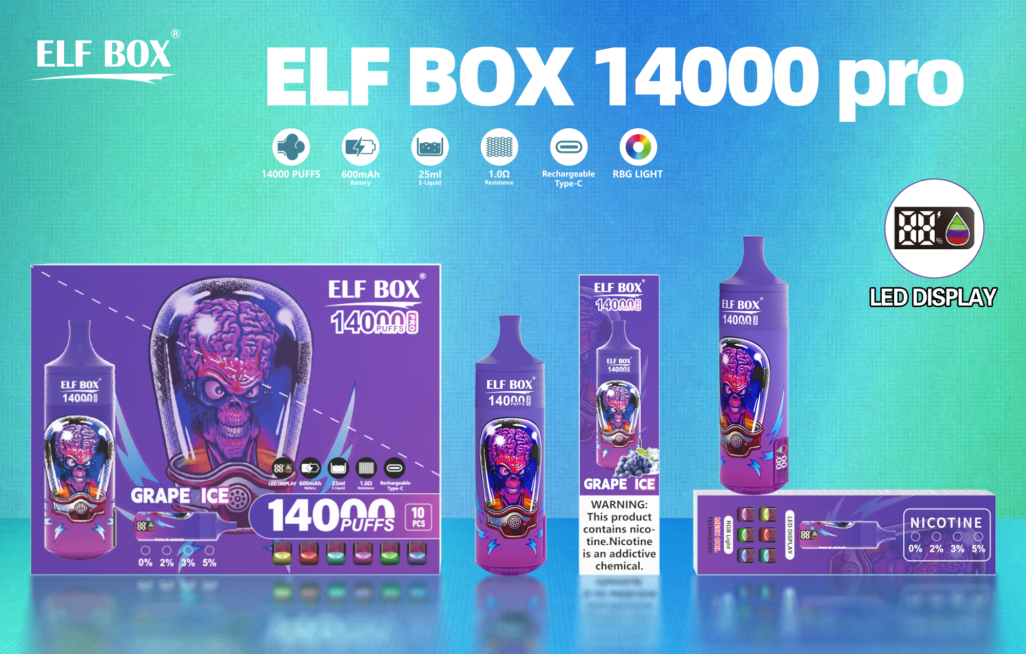 The ELF BOX 14000 Pro RGB vape is a high-end rechargeable disposable vape with 25 ml of capacity and 4 salt levels (0 2% 3% 5%) for up to 14,000 refreshing puffs