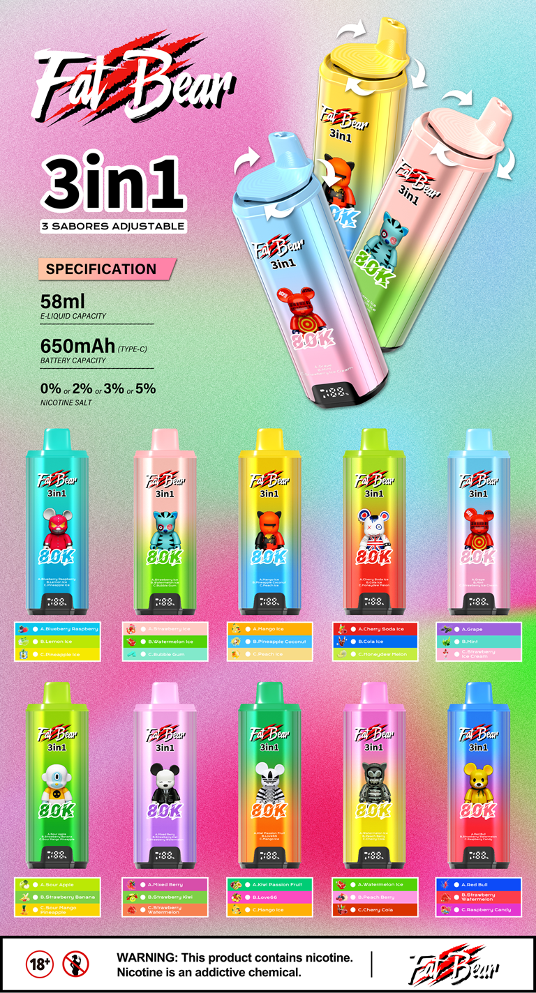 What makes the Fat Bear extra special? It’s a 3-in-1 flavor rotation vape, which means three distinct flavors in one device—just twist to switch and keep your taste buds surprised! Say goodbye to single-flavor boredom and hello to a dynamic vaping experience that evolves with every puff.
